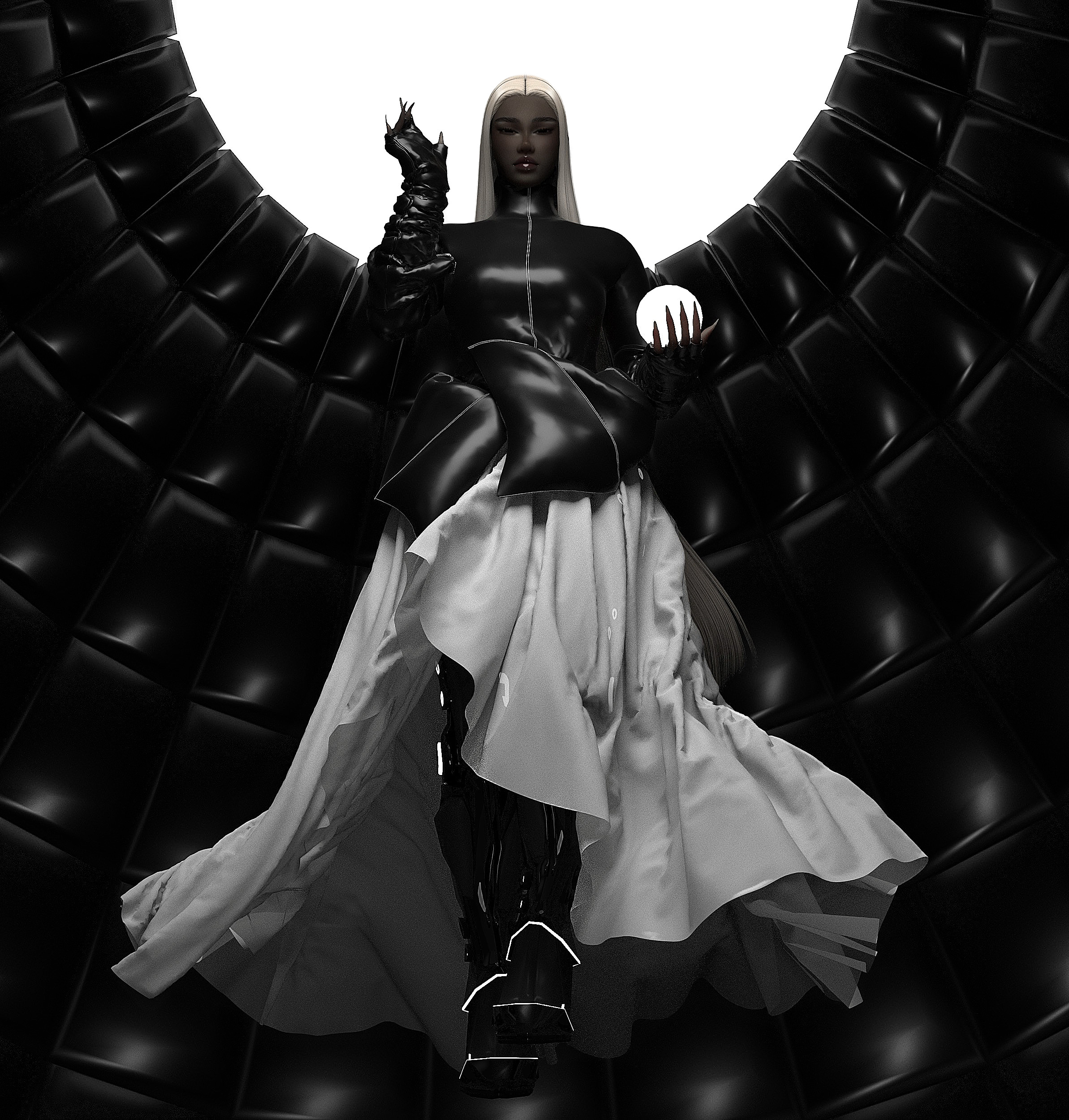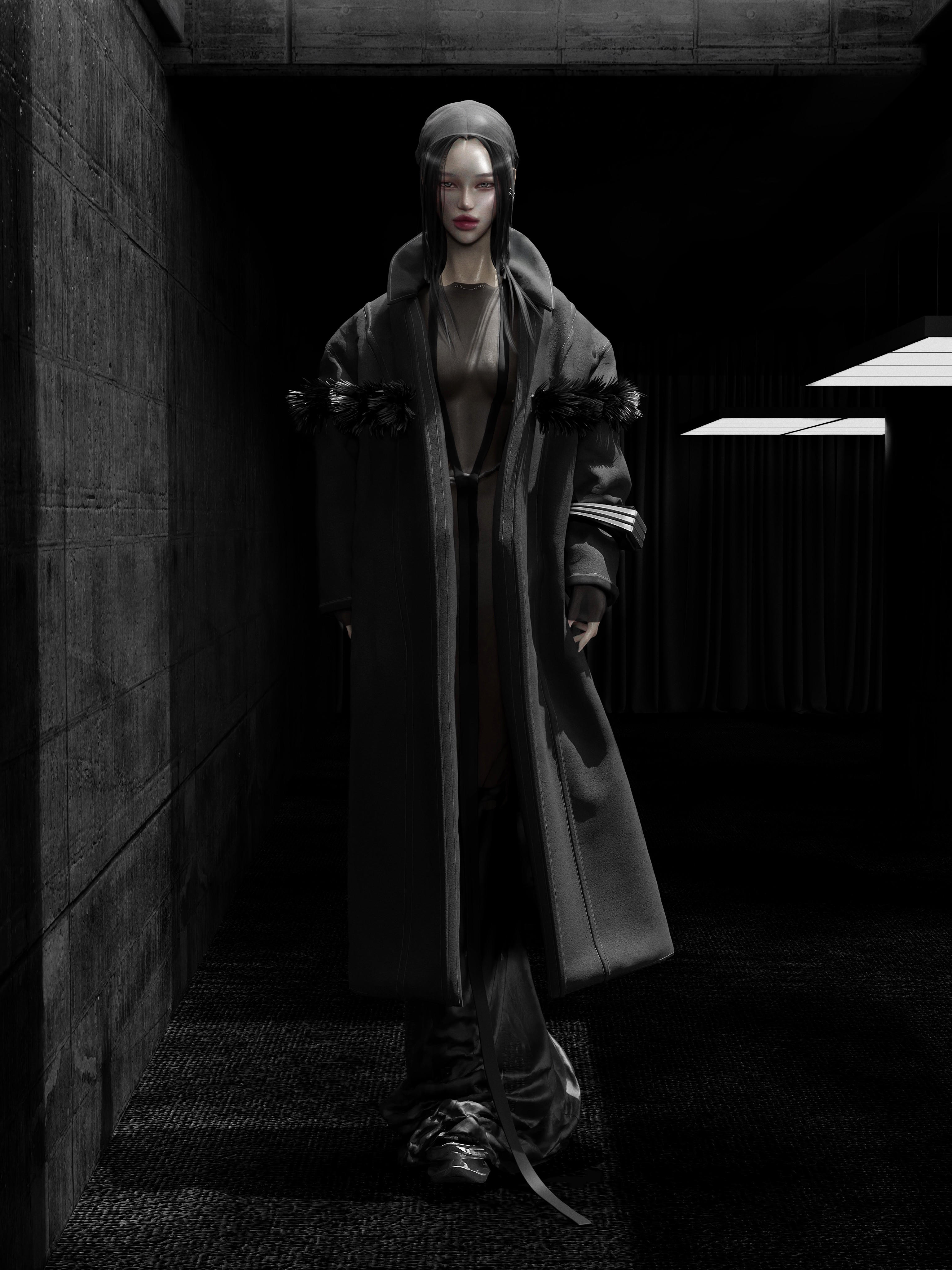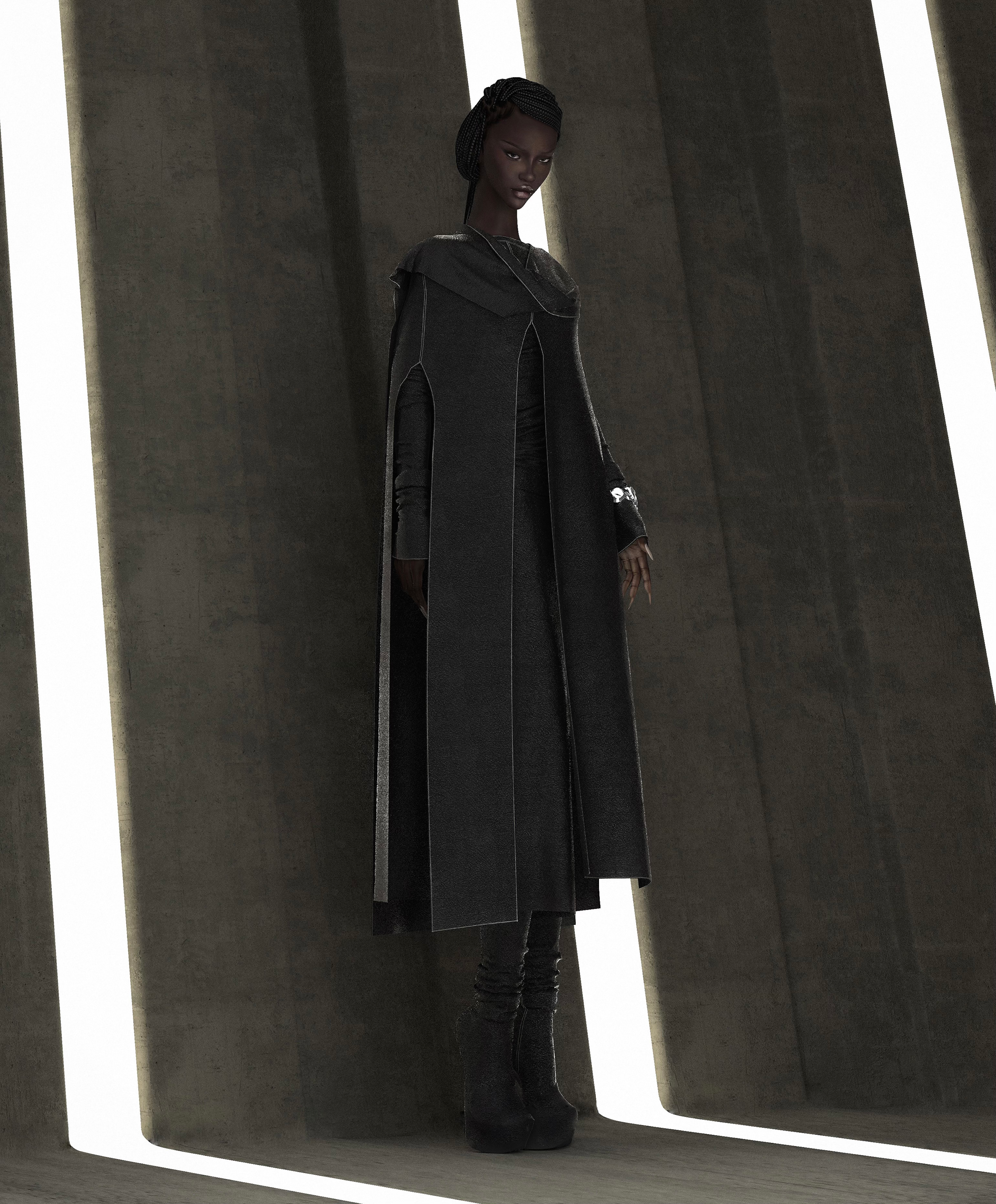 INVASION COLLECTION PART I TAKES PLACE IN THE ALIEN MOTHERSHIP. A BLACK SHINY MATERIAL IS USED TO HIGHLIGHT THE OTHERWORLDLY, UNNATURAL FEEL OF THE COLLECTION. THE IDEA BEHIND THE PIECES WAS TO CREATE A KIND OF PETROLEUM FLOW FROM ONE LOOK TO THE OTHER.THE ENVIRONMENT IS SET TO ENHANCE THE UNCANNY AND GHOSTLY STYLING.