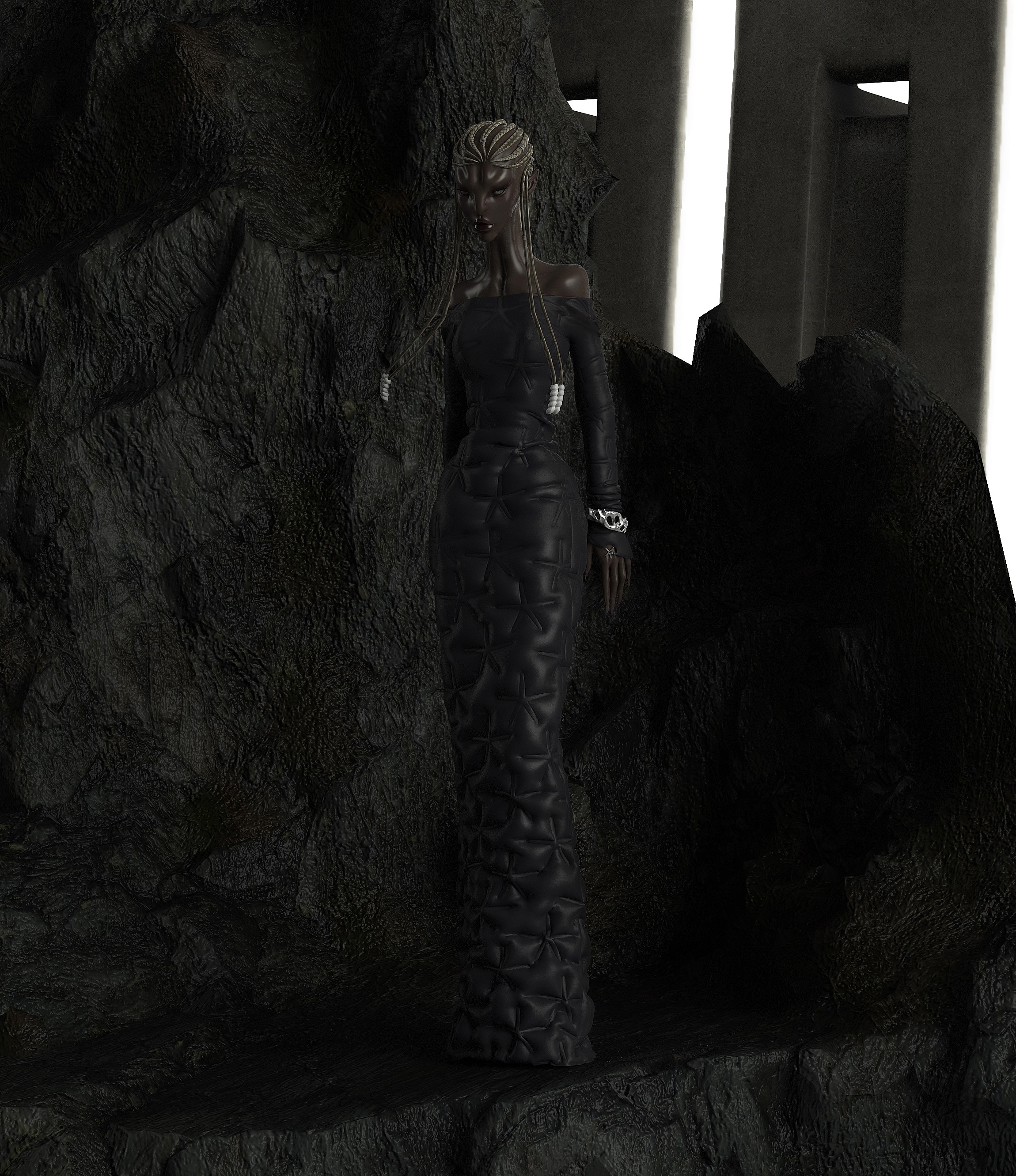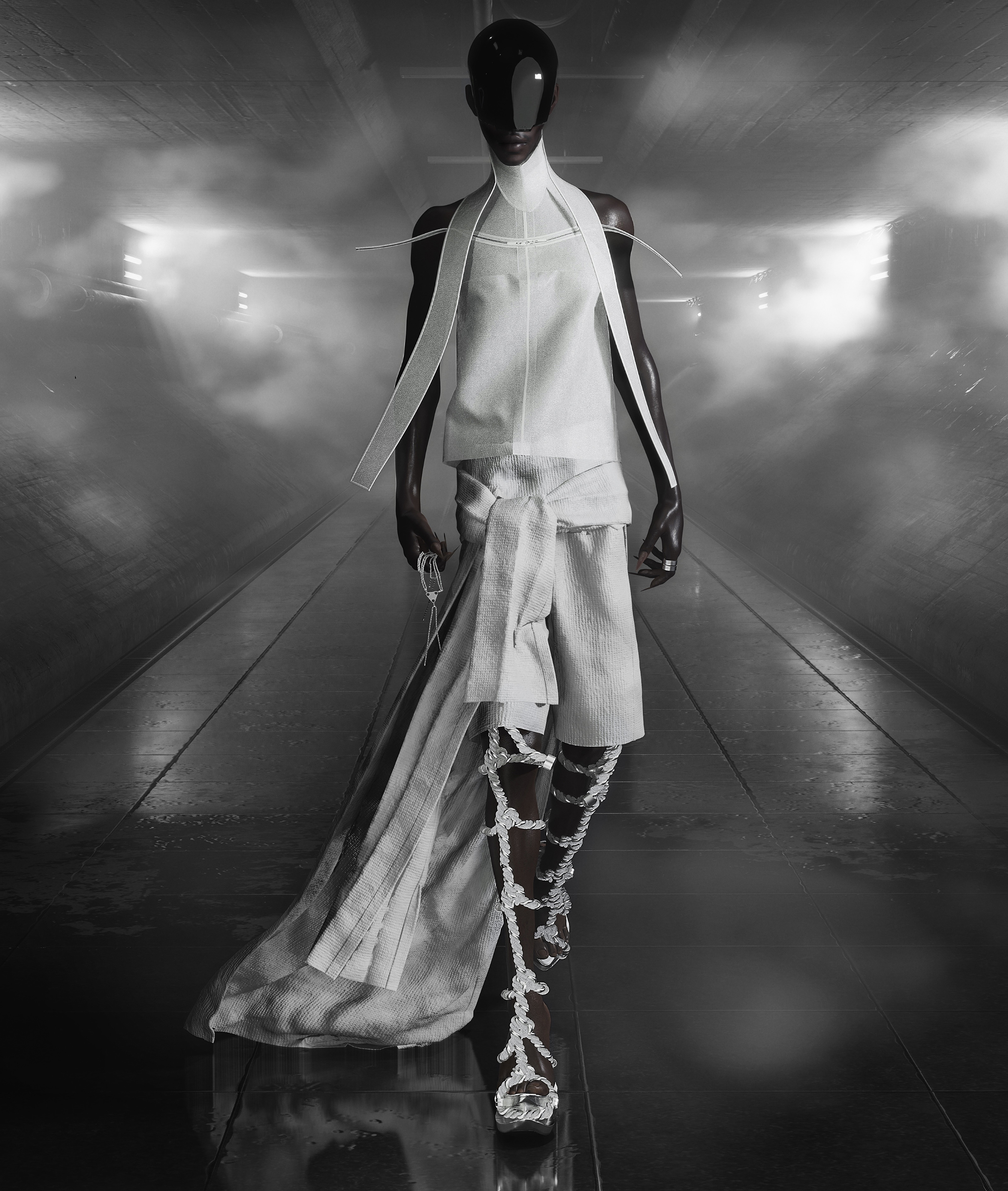 THE DESIGNS ARE BASED ON RESTRAINTS/LINKS USED BY THE SCIENTISTS TO KEEP THE ALIENS FROM MOVING DURING THEIR EXPERIMENTATIONS. THIS THEME OF " BANDS" IS USED THROUGHOUT THE ENTIRE COLLECTION, FROM PLEATS, FUR LINES OR BRIDAL-LIKE TRAILS TO ACTUAL WRAPPED PIECES.
